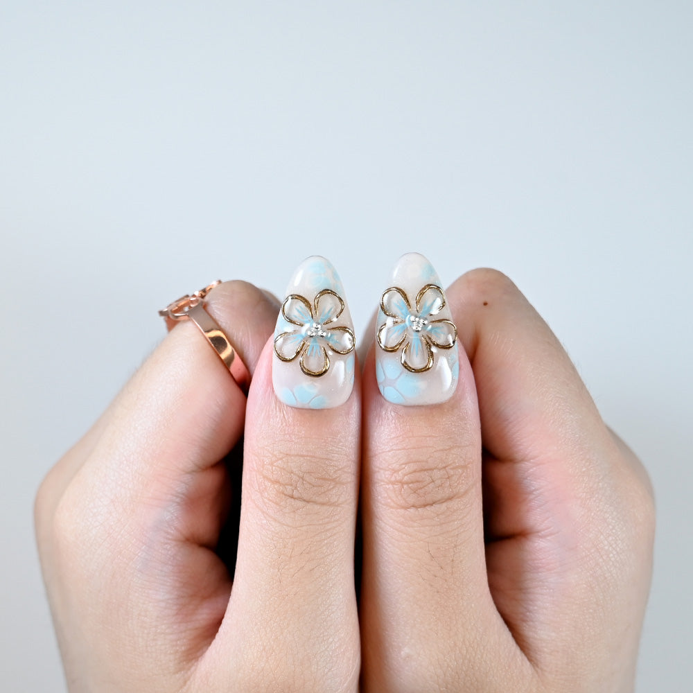 Inspired by the soft chill of winter mornings—frosty blue 3D petals, golden chain accents, and snow-dusted dots create a dreamy winter bloom.