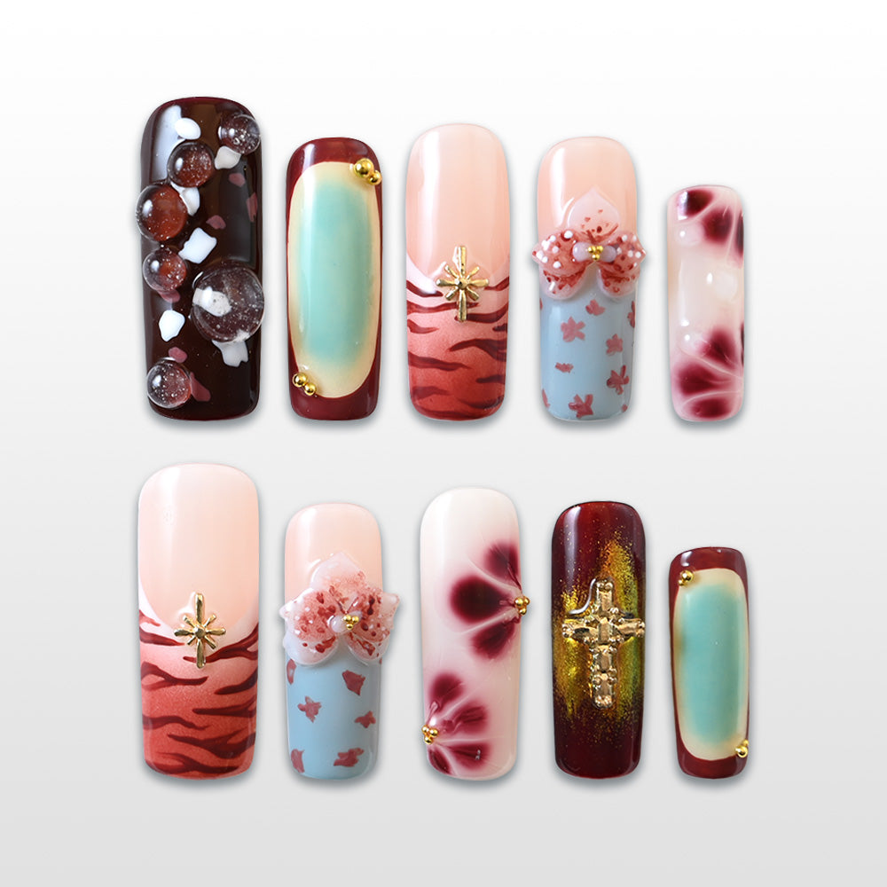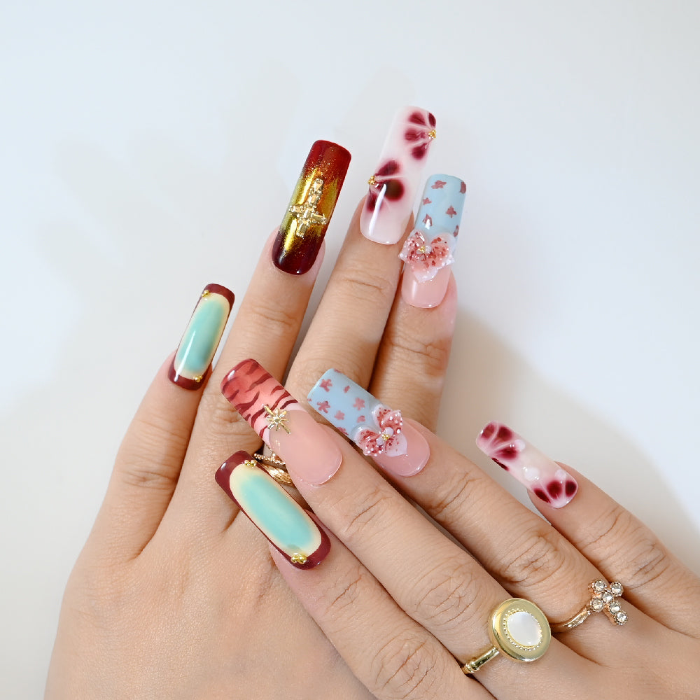 A bold fusion of red animal print, aqua gradients, 3D bows, and gold cross charms—fierce, artistic, and full of contrast.