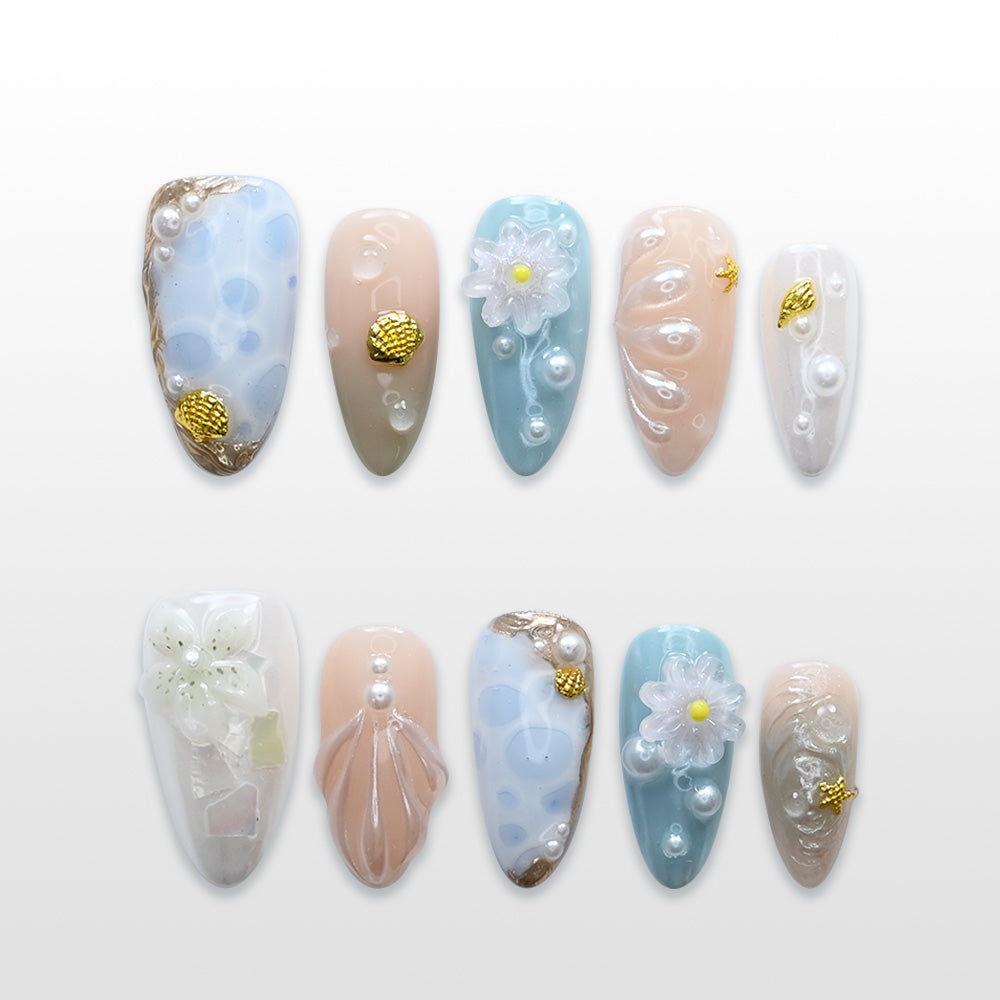 Inspired by seafoam shores and delicate blooms—this design features shell-like waves, pastel blue and nude hues, 3D daisies, pearl bubbles, and golden sea elements for a dreamy beach-fairy vibe.